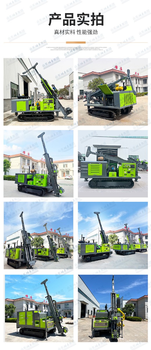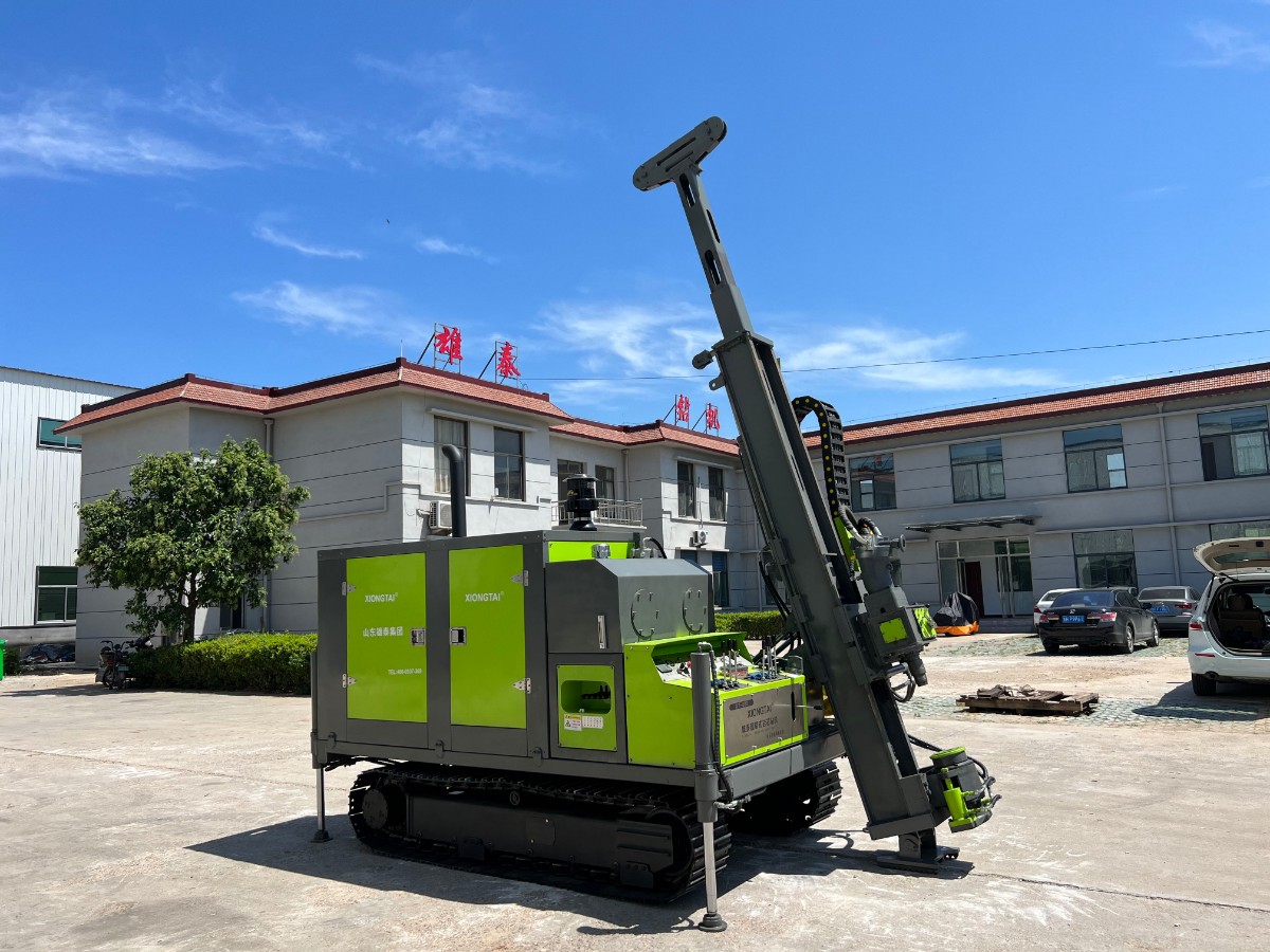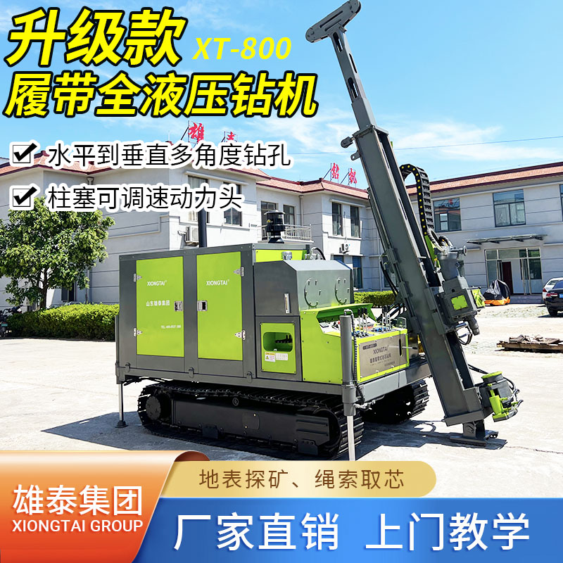 山東雄泰集團(tuán)自主研發(fā)生產(chǎn)的履帶式全液壓鉆機(jī)的無(wú)線遙控行走、液壓桅桿自動(dòng)升起,動(dòng)力頭自動(dòng)左側(cè)移機(jī)提鉆為該款鉆機(jī)一大特色。其中桅桿自動(dòng)升起,動(dòng)力頭移機(jī)為我公司實(shí)用新型專(zhuān)利,極大緩解了現(xiàn)場(chǎng)施工的難度,有效減小了鉆機(jī)施工人數(shù),節(jié)約了成本,該履帶式全液壓鉆機(jī)分別采用76KW/115KW發(fā)動(dòng)機(jī),動(dòng)力強(qiáng)勁,扭矩大,適用于各類(lèi)復(fù)雜地層的金屬礦開(kāi)采。